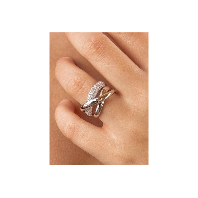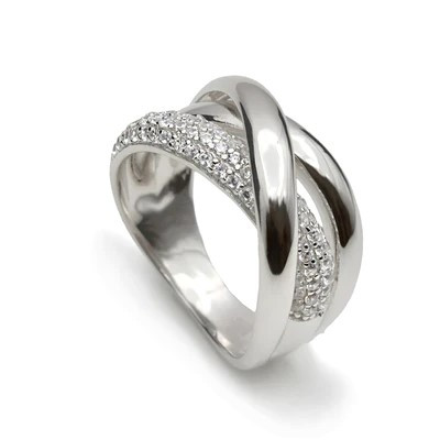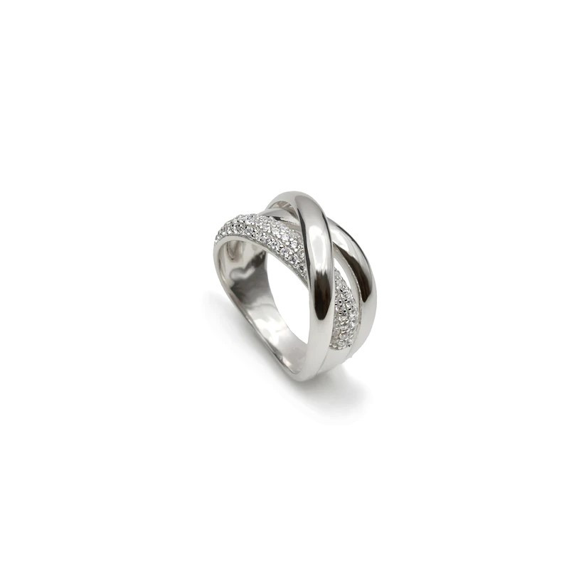 Anillo ancho de plata cruzado con circonita, una joya elegante y de diseño contemporáneo.
