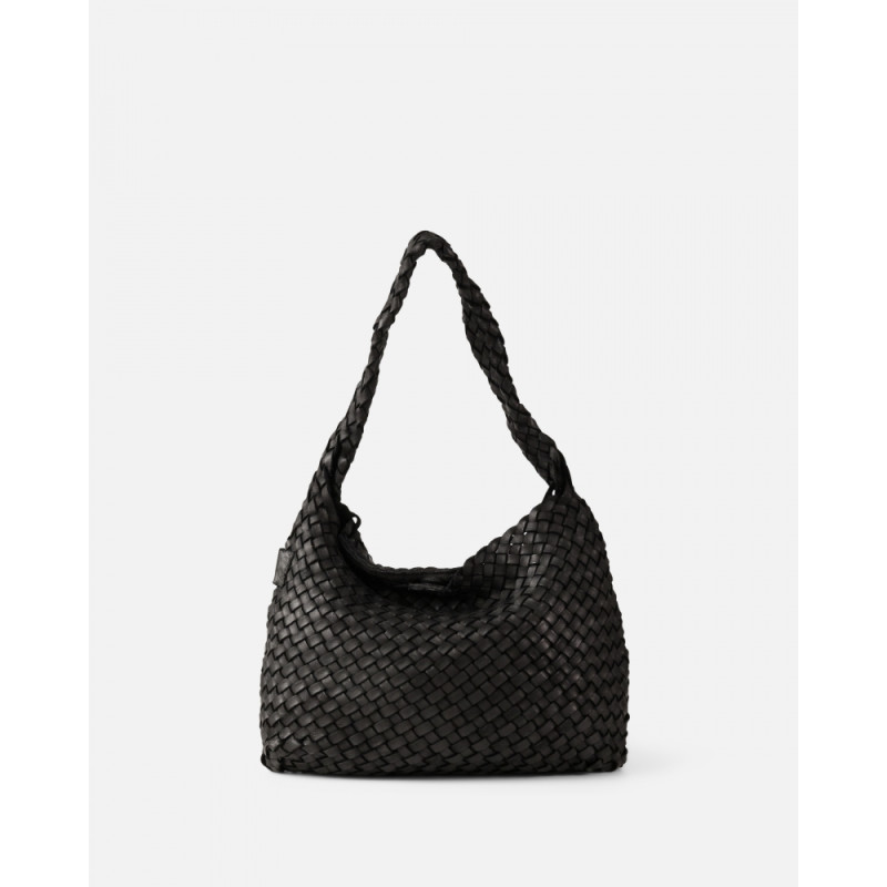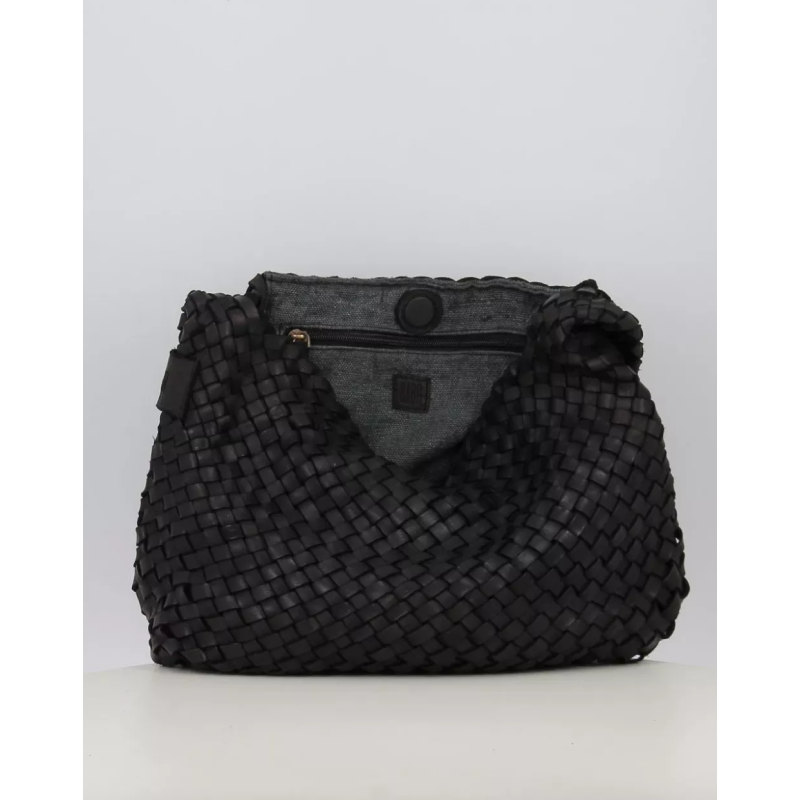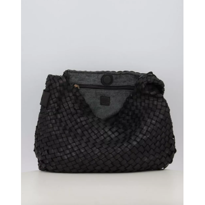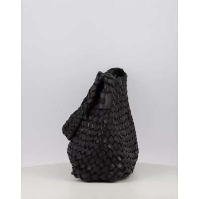 Bolso de piel vacuna lavada y trenzada en color negro. Sin costuras, es decir hecho de una sola pieza trenzada.