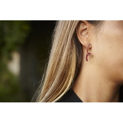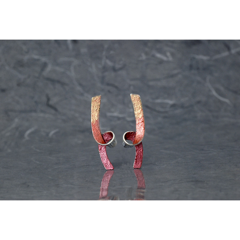 Pendientes de presión largos Bakú. Llevan un acabado combinado del brillo pulido de la plata con unos pigmentos metálicos irisados, muy actuales en tonos rojizos.